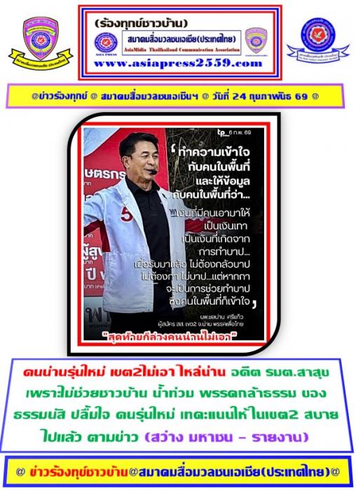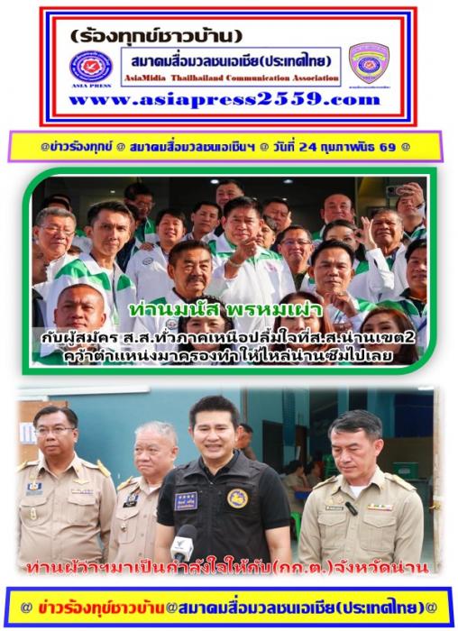 วันที่ 22 กุมภาพันธ์ 69ที่ผ่านมาเป็นการลงคะแนน(ส.ส.น่าน)วันสุดท้ายปรากฎว่ารวมคะแนนแล้วได้ (ส.ส.มา3ท่าน)แต่ไม่มีพรรคแชมป์เก่า เพื่อไทย)มีแต่พรรค กล้าธรรมเขต2ได้มา1คน กับ(พรรคประชาชน)ได้ ทั้ง 2 เขต 1กับ เขต 3 (ส่วนเขต2หมอไหลน่านชาวบ้านไม่เอาเศร้าใจไปแล้ว)ชาวน่านไปเทคะแนนให้(พรรคกล้าธรรมที่ ท่าน ธรรมมนัส พรหมเผ่า)นำชาวบ้านจากพะเยาขนรถแบรกโครรถน้ำกว่า20กว่าคันของมูลนิธิฯมาช่วยชาวน่านดังกล่าว ชาวบ้านพญาวัดเตรียม ทำหนังสือร้องเรียนท่าน..(รองนายก รมต.ร.อ.ธรรมนัส พรหมเผ่า) ผ่าน ส.ส.น่านเขต2 ต่อไปตามข่าว(สว่าง มหาชน -รายงาน / ปอร์ คุ้มพระล้อ – นำเสนอข่าว)..เข้าไปดูข่าวได้ที่.www.asiapress2559.com
