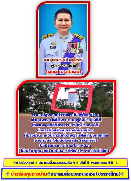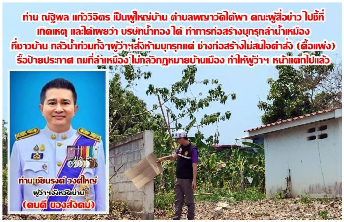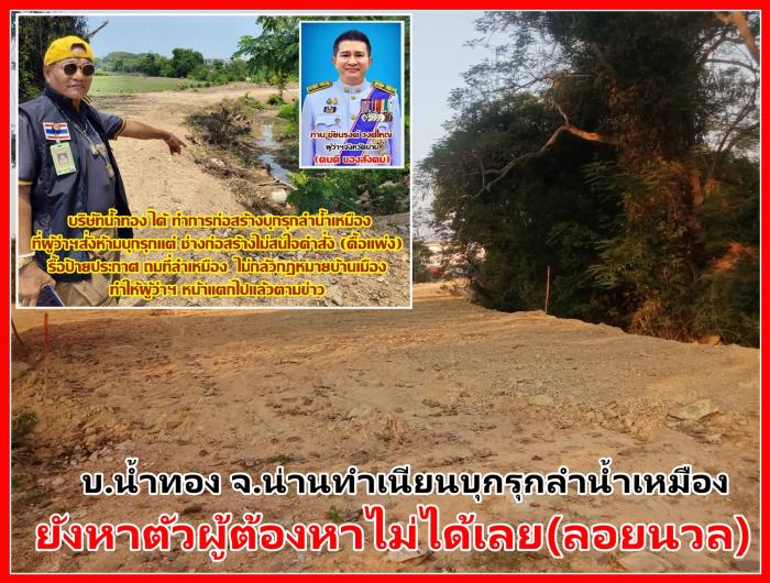 ที่ ตำบลพญาวัดหมู่ที่ 6 อำเภอดู่ใต้ตำบลดู่ ใต้อำเภอเมืองจังหวัดน่าน ผู้สื่อข่าว ศูนย์ข่าวภาคเหนือ ได้รายงานเข้ามาอีกว่า เมื่อวันที่ 22 กุมภาพันธุ์ 2569 ว่า...บริษัทน้ำทอง จำกัด ได้ทำการก่อสร้าง เพิ่มเติมอีก โดยไม่สนใจ กฎหมายบ้านเมือง ขนาดผู้ว่าฯสังการ ให้เอาผิด ผู้บุกรุก (ลำเหมืองวางท่อทำถนนในการสร้างบ้านขาย) ไม่สนใจที่เทศบาลตำบลบ้านดู่ เอาป้ายไปติด ยังทำลายป้ายประกาศ คำสั่งผู้ว่าฯออก โดยไม่เกรงกลัวกฎหมาย หลังสุด ผู้สื่อข่าว รายงานมาว่าเมื่อวันที่ 22 กุมภาพันธุ์ 2569 ว่า ชาวบ้านใกล้เคียงที่ตั้งติดกับ บริษัท น้ำทอง จำกัด โดนเทศบาลตำบลบ้านดู่ เอารถแม็คโคร มาหรือบ้านที่อยู่อาศัยของชาวบ้าน (แต่น้ำทองบุกรุกลำน้ำเหมือง เห็นจะๆไม่ไปทุบแต่มาทุบชาวบ้านตาดำๆ) ชาวบ้านทนไม่ไหวเตรียมตัวร้องเรียนท่าน(รองนายก รมต.ร.อ.ธรรมนัส พรหมเผ่า) ผ่าน ส.ส.น่านเขต2 ต่อไป และเมื่อ...