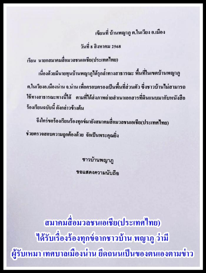 ชาวบ้าน พญาภู เทศบาลเมืองน่านโวยลั่น โดนผู้รับเหมา รายใหญ่ ในเทศบาลเมืองน่าน (ยึดถนนปิดทาง) ที่ (บ้านพญาภู) ทำให้ชาวบ้านเดือดร้อนมานานแล้ว! จึงมาร้องสมาคมสื่อฯ ให้ทางเทศบาลเมืองน่าน ตรวจสอบให้หน่อย ว่ามันเป็นถนนสาธารณะ หรือไม่ ตามข่าว