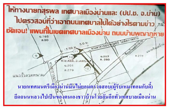 ชาวบ้าน พญาภู เทศบาลเมืองน่านโวยลั่น โดนผู้รับเหมา รายใหญ่ ในเทศบาลเมืองน่าน (ยึดถนนปิดทาง) ที่ (บ้านพญาภู) ทำให้ชาวบ้านเดือดร้อนมานานแล้ว! จึงมาร้องสมาคมสื่อฯ ให้ทางเทศบาลเมืองน่าน ตรวจสอบให้หน่อย ว่ามันเป็นถนนสาธารณะ หรือไม่ ตามข่าวจึงขอให้ (นายสุรพล นายกเทศบนตรี หลายสมัยช่วยตรวจสอบข้อเท็จจริง) ที่ชาวบ้านร้องมาตามรูปภาพที่ส่งมาให้ทางสมาคมฯ นั้นว่าเป็นถนนสาธารณะ หรือไม่ดังกล่าว เพื่อให้ชาวบ้านที่เดือดร้อนร้องมาสบายใจดังกล่าวตามข่าว (ข่าวคือหน้าจะนำมาเสนอต่อไป)