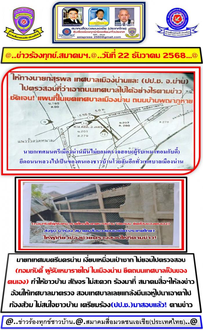 Tag : ชาวบ้าน พญาภู เทศบาลเมืองน่านโวยลั่น โดนผู้รับเหมา รายใหญ่ ในเทศบาลเมืองน่าน (ยึดถนนปิดทาง) ที่ (บ้านพญาภู) ทำให้ชาวบ้านเดือดร้อนมานานแล้ว! จึงมาร้องสมาคมสื่อฯ ให้ทางเทศบาลเมืองน่าน ตรวจสอบให้หน่อย ว่