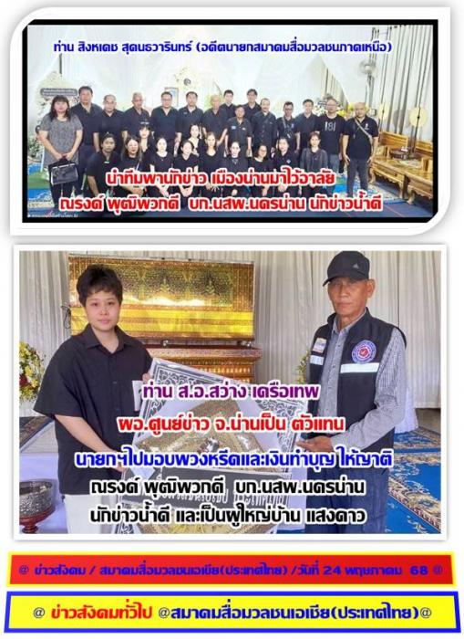 ที่ วัดแสงดาว อ.ภูเพียง จ.น่าน เมื่อวันที่ 24 พฤษภาคม 2568 ผู้สื่อข่าวรายงานเข้ามาว่า ท่าน สิงหเดช สุคนธวารินทร์ (อดีต)เลขาฯสมาคมสื่อมวลชนภาคเหนือ 17 จังหวัด และบก.นสพ.นครน่าน