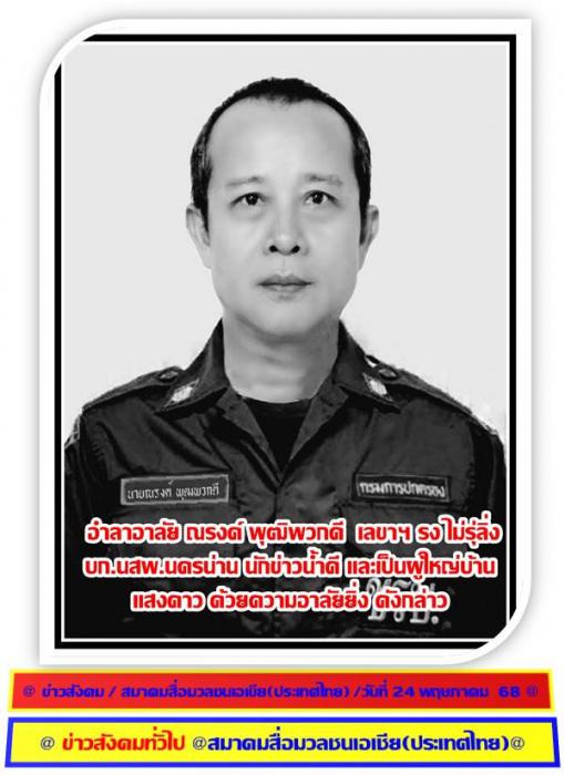 ในการจากไปของท่านเลขาฯ รง ไม่รุ่งลิ่ง ครั้งนี้ทำให้ วงการสื่อมวลชน เมืองน่าน ตกใจไม่น่าเชื่อว่า ท่าน รง จะจากไปเร็วขนาดนั้นทำให้สื่อมวลชนภาคเหนือ17จังหวัดตกใจกันไปหมดว่ามันใช่หรือไม่ สุดท้ายได้ยืนยันชัดเจนจาก