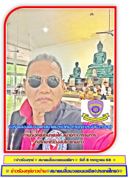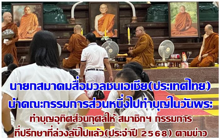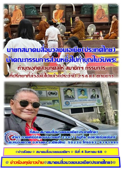 เมื่อวันที่ 3 สิงหาคม 2568 นายกสมาคมสื่อมวลชนเอเชีย(ประเทศไทย)นำคณะกรรมการส่วนหนึ่งไปทำบุญในวันพระ เพื่ออุทิศส่วนกุศลให้